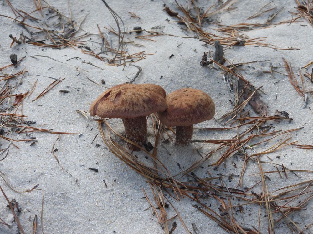 Two mushrooms are seen growing among sand and pine needles along a trail in Cape Henlopen State Park in Delaware.