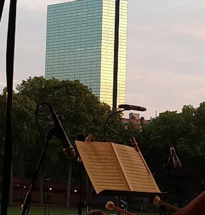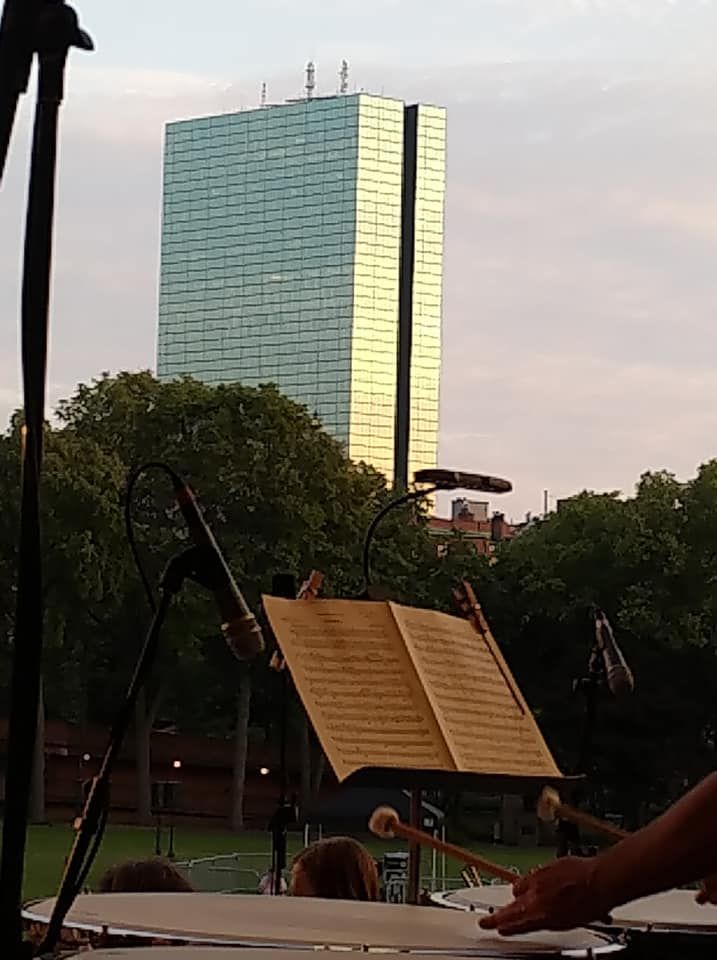 Waiting for the concert Spirituals and Showboat at the Hatch Shell with Boston's Landmarks Orchestra One City Choir to begin and admiring the Prudential building.