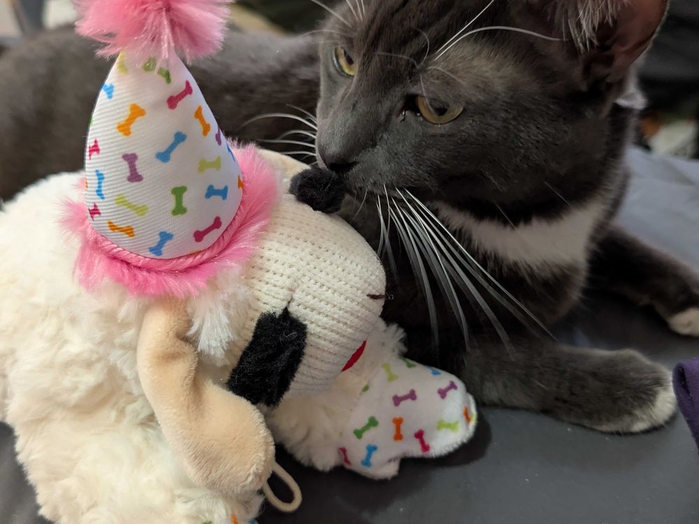 My cat Smokey and Lamb chop dog toy with birthday hat to celebrate my 70th birthday