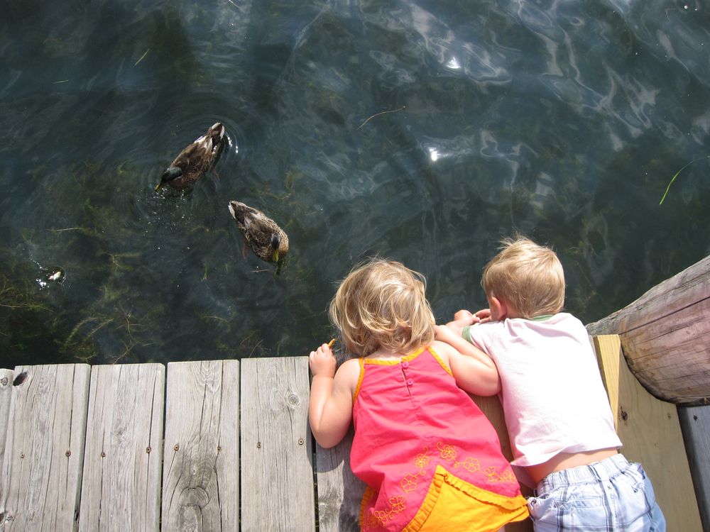 My children, watching some ducks from a dock.