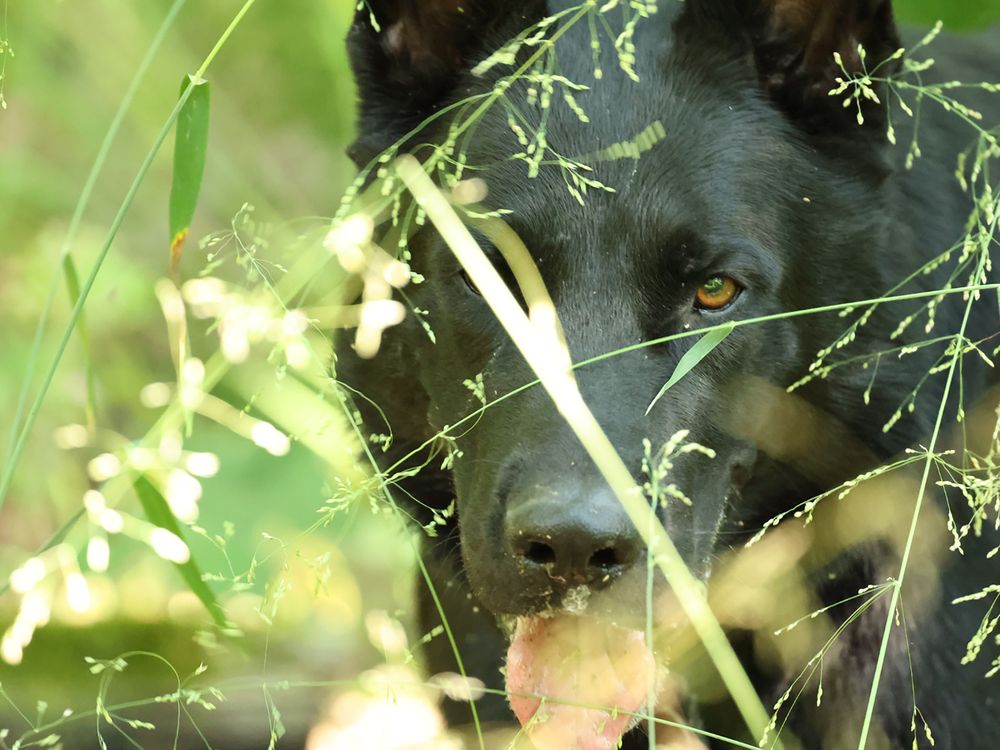 Photo was taken in the woods in Luxembourg. The dog was posing behind the grasses and I used my Canon camera for the first time. I thought it turned out to be a creative shot.