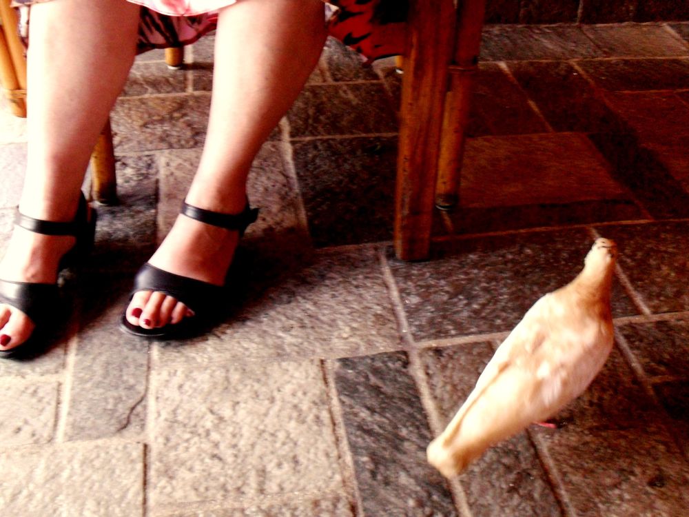 My mom's feet with pigeon under the restaurant table in Honolulu