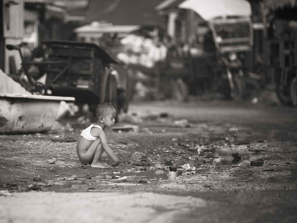A child with undecent dress is playing while peeing in front of his house in a slump area of the capital city of Jakarta