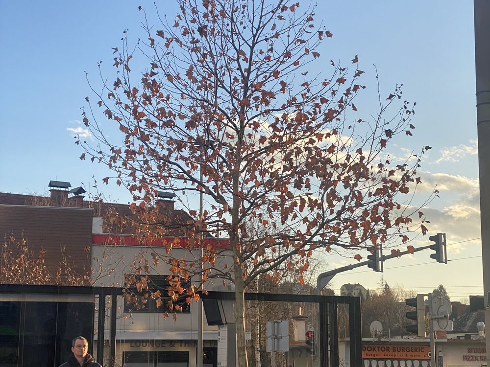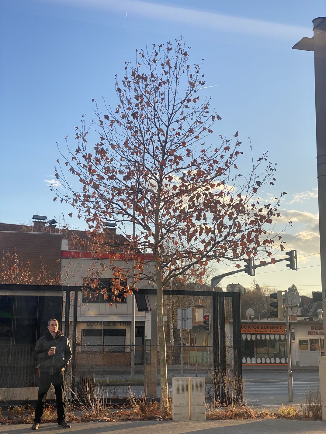 This photo was taken while I was completing my medical internship in Graz, Austria. Across the tram station stood a maple tree glowing in warm autumn light, and beneath it was a gentleman quietly waiting. The tram was running late, giving me time to take in the scene.