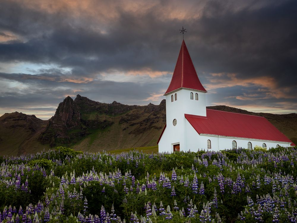 Iconic church near Vik, Iceland. Churches in smaller towns in Iceland are very similar to this one. Set on a hill overlooking the town and north Atlantic Ocean.