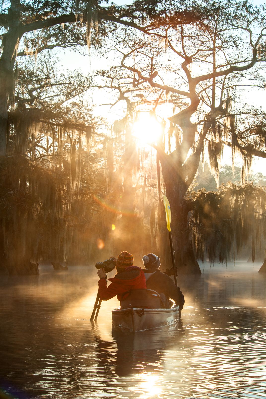 A photographer and her husband kayak in the swampy waters of South Louisiana during a misty winter morning among centuries old Bald Cypress trees laden with Spanish Moss.