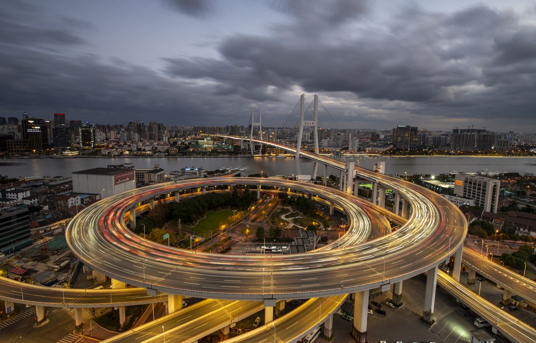 Nanpu Bridge Take a bridge across the Huangpu River on the roof of the community. At the peak of the community, the trajectory of the car lights and winding bridges form a day dragon.