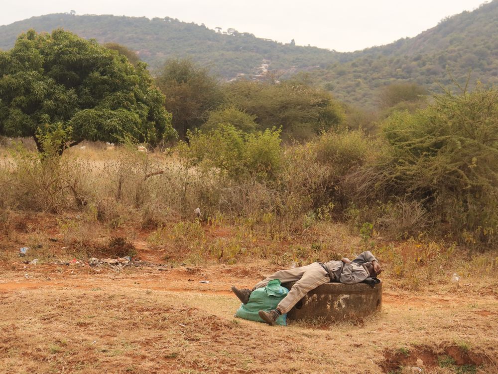 NAP TIME! A man takes a nap on the roadside while waiting for transport, in rural Kenya. He wraps his legs around his belonging to keep it safe.