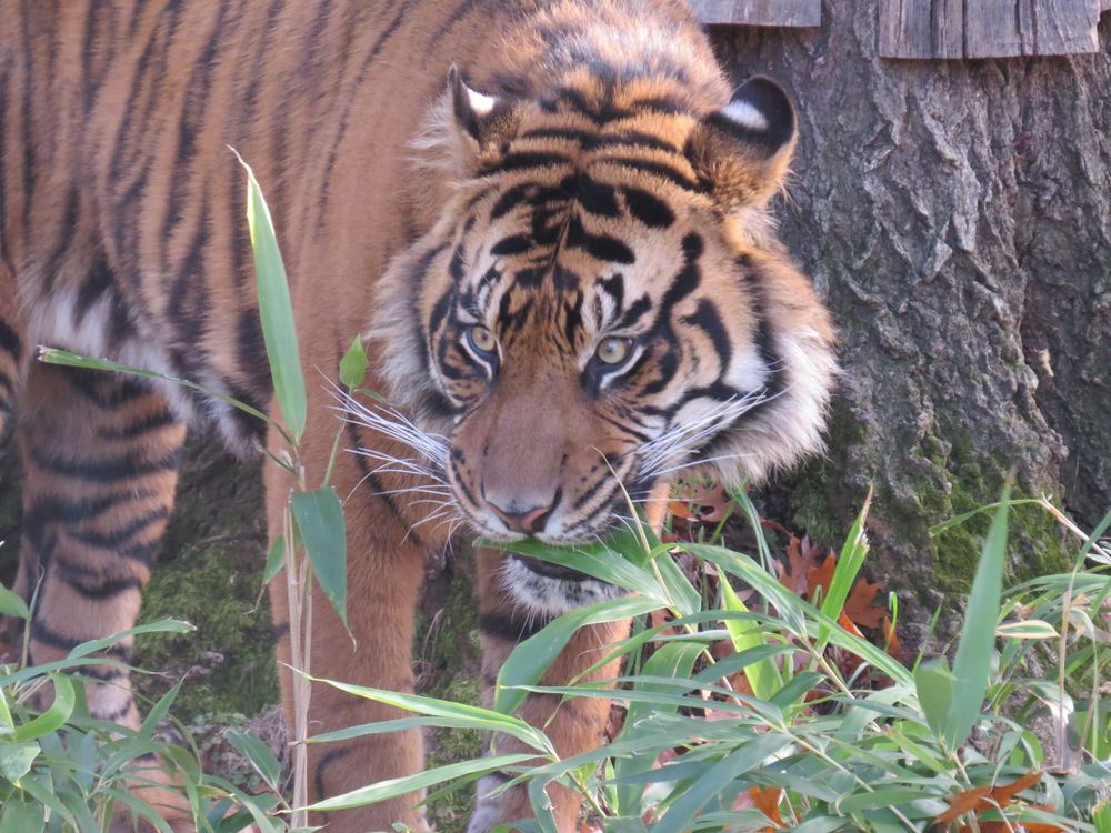 Tiger watches the crowd while munching on a snack.