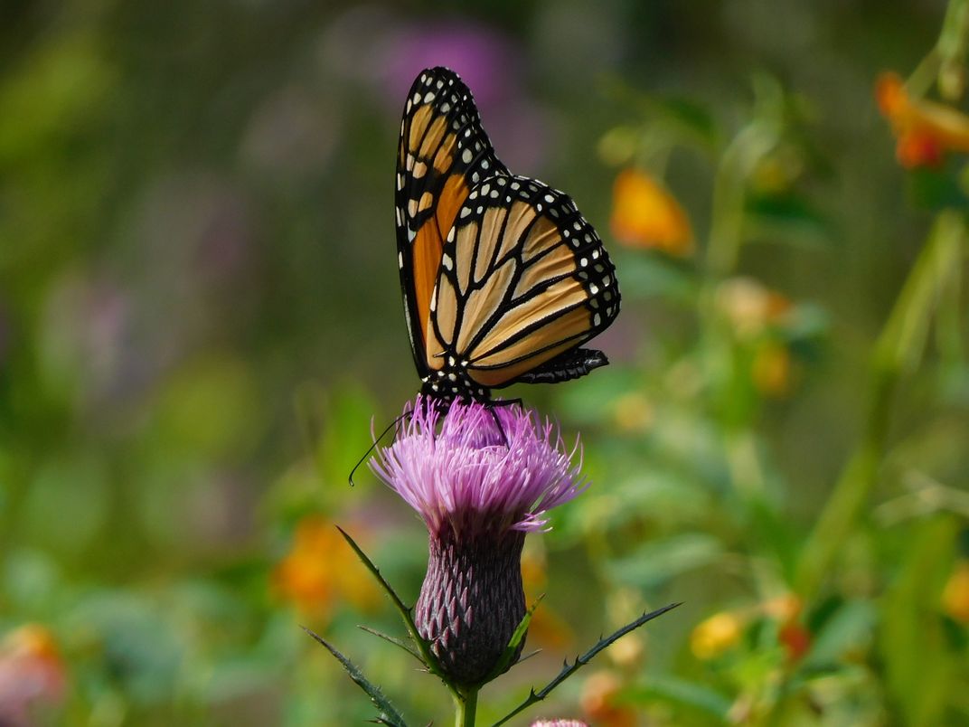 Beautiful Monarch butterfly in a field of wildflowers. I took this picture in Fairborn, Ohio, at Pearl's Fen, a wetland area that has a lot of wildflowers, a brook, and woods. The butterfly landed on this plant and was in perfect alignment. I love the colors in this picture as well - they seem to go so well together. Pearl's Fen is a peaceful area, and butterflies always bring a little beauty to its surroundings.
