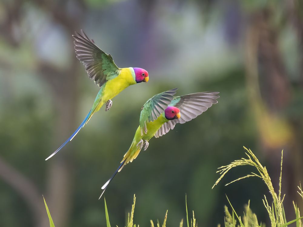 Two Plum-headed Parakeets are flying for food on the paddy fields.