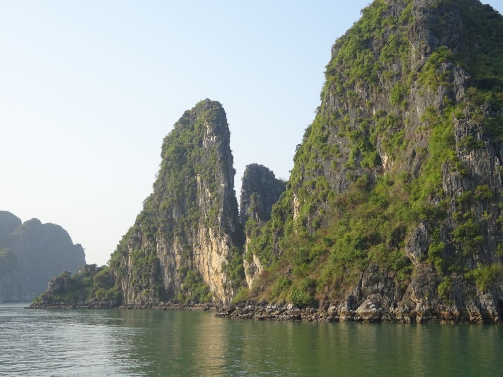 Striking near-vertical rock formations jut out of HaLong Bay in Vietnam.