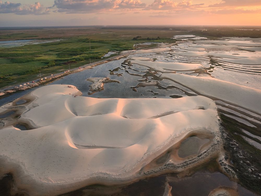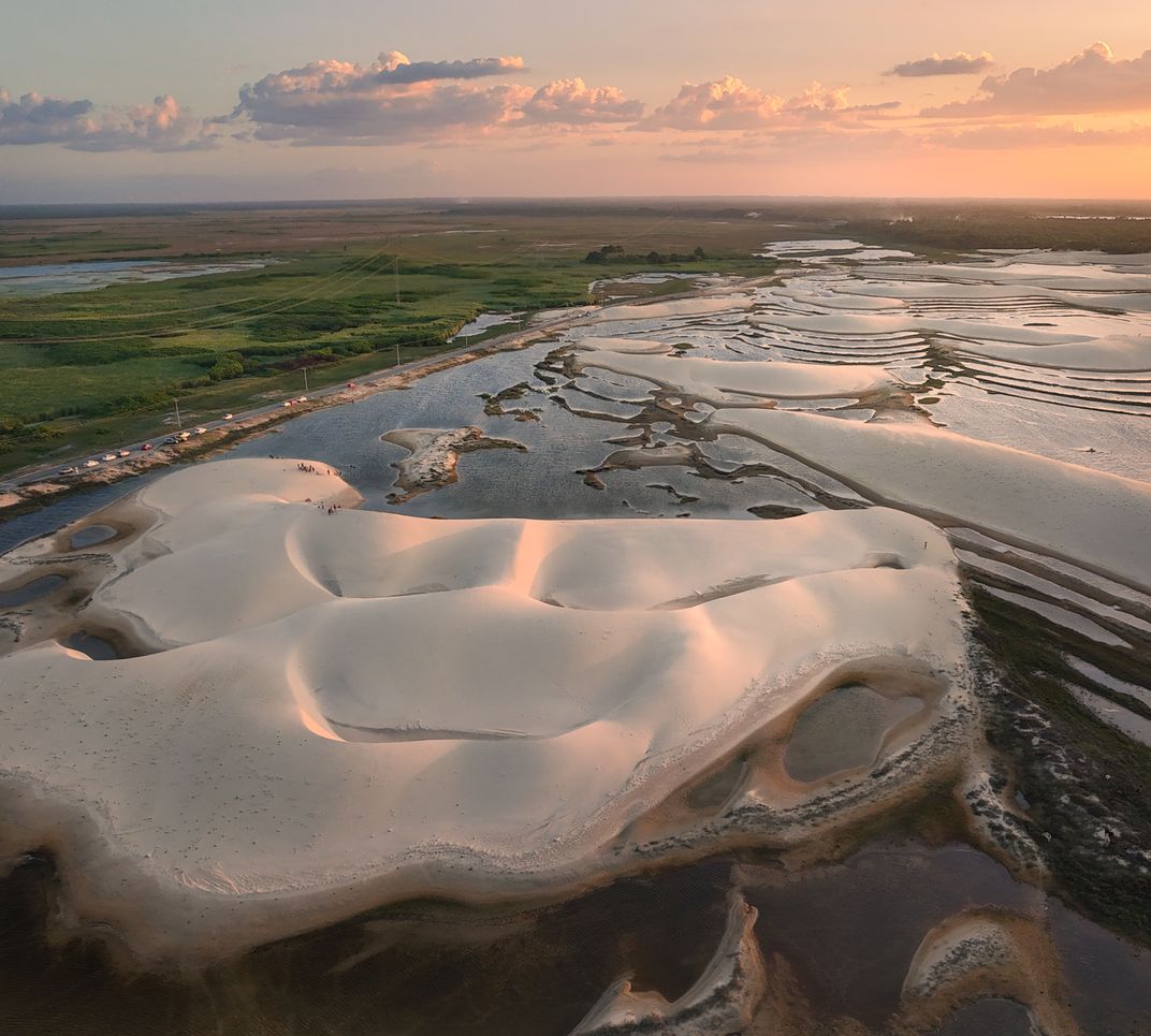 This image is showing the white sand dunes and lagoons at sunset time. A very unique shape- a human face with two eyes, a nose and a big mouth is revealed. It also looks like a face mask from the broadway show "The Phantom of the Opera". The lagoons are formed temporarily from rain in the summer. Nature can produce anything!