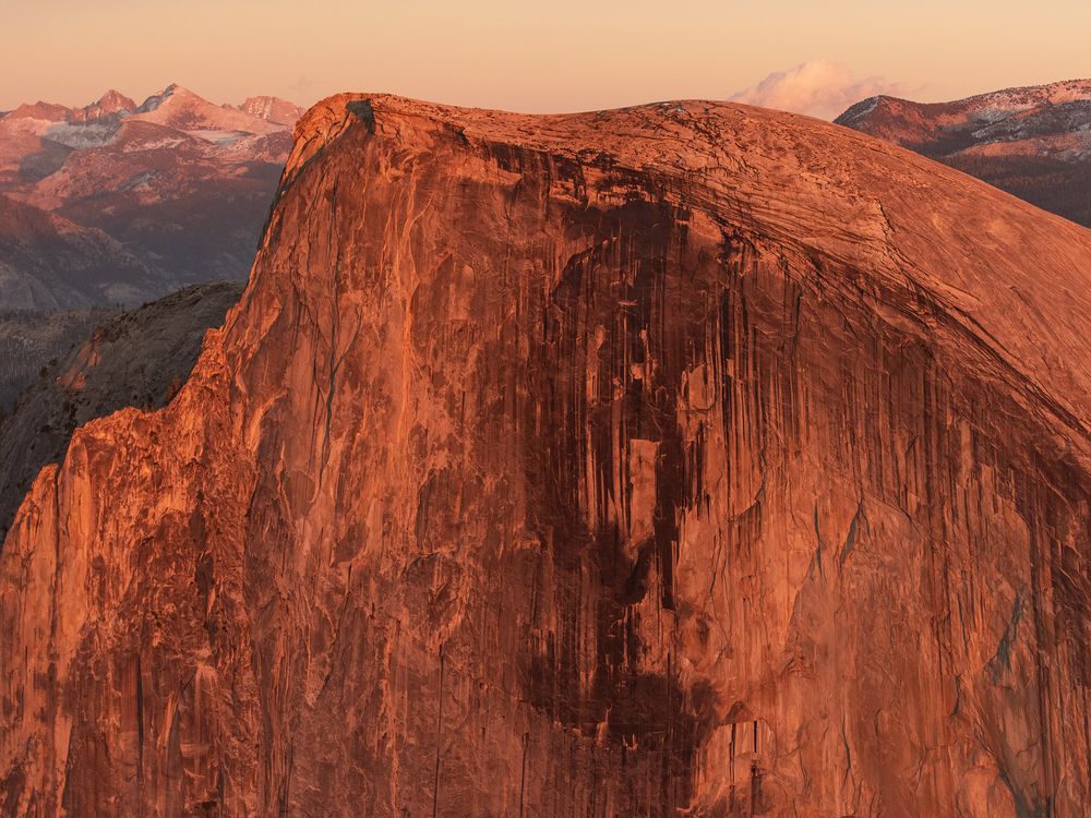 Bathed in sunset, Half Dome’s granite face glows red and gold, carved by glaciers and wind. A tiny plane near its peak underscores nature’s grandeur and humanity’s smallness against this timeless monument.