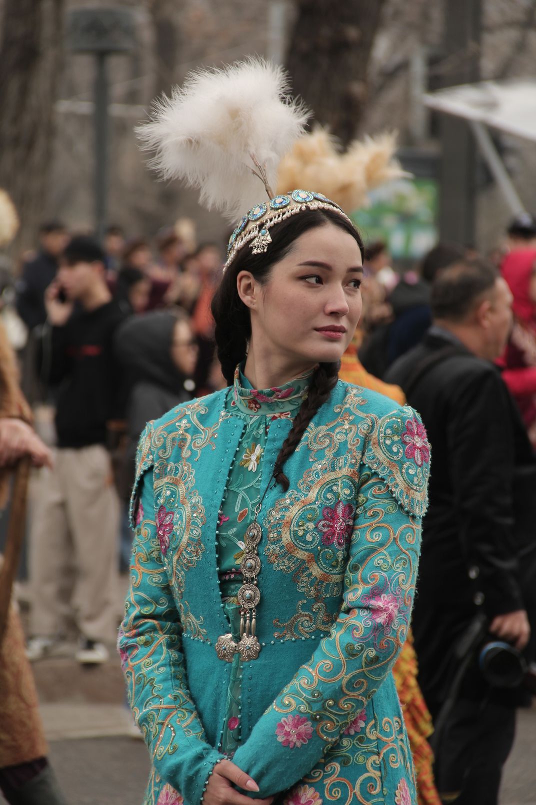 A girl in a costume stylized as a traditional Kazakh outfit at the Nauryz holiday