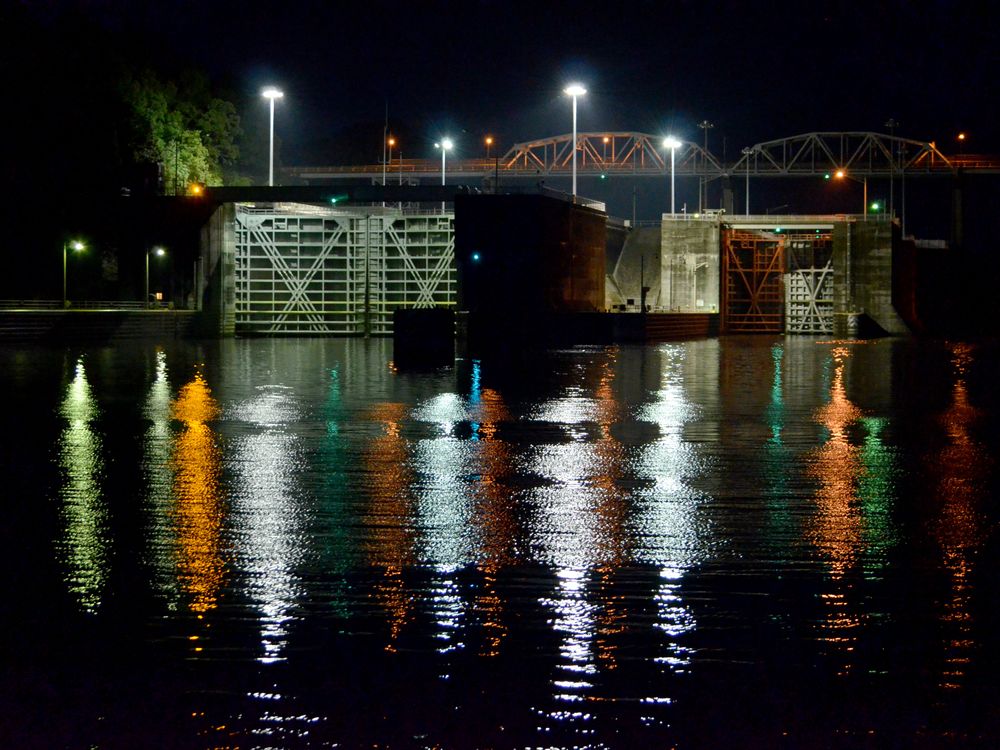 Navigating the Tennessee River System's Wilson Lock and Dam at night.
