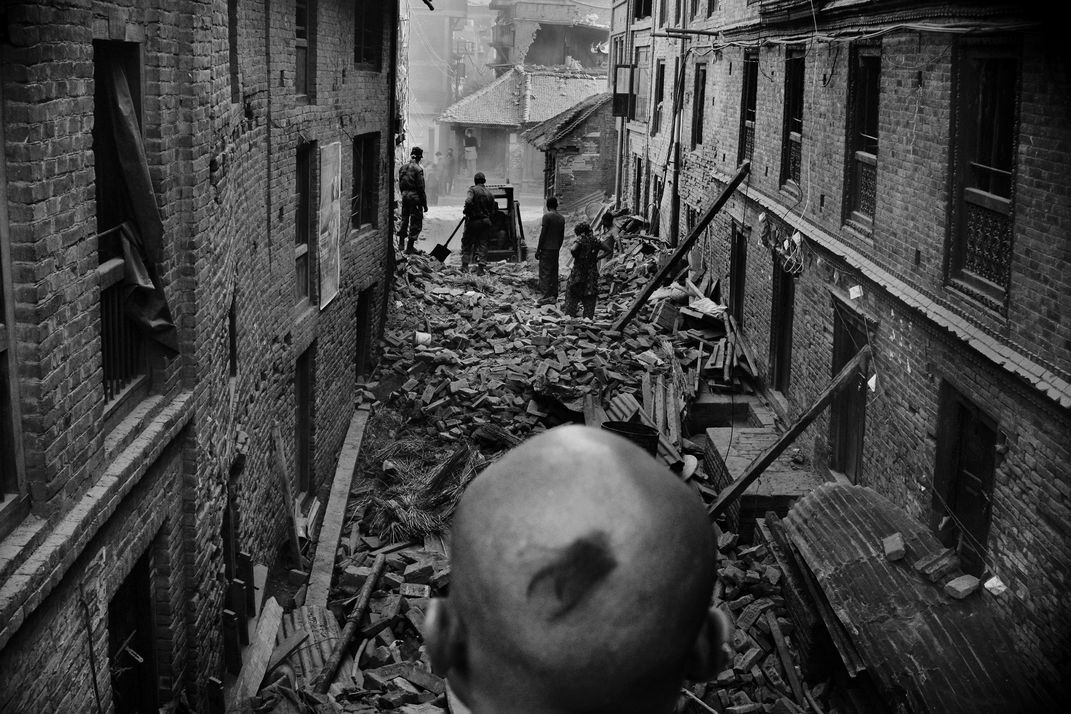 P. Prasad Gwasa, a resident of Bhaktapur, Nepal looks down upon the ruins of his broken house after the Nepal 2015 earthquake. He shaved his head as a part of a ritual which followed after the demise of his mother who was trapped in debris of their broken house.