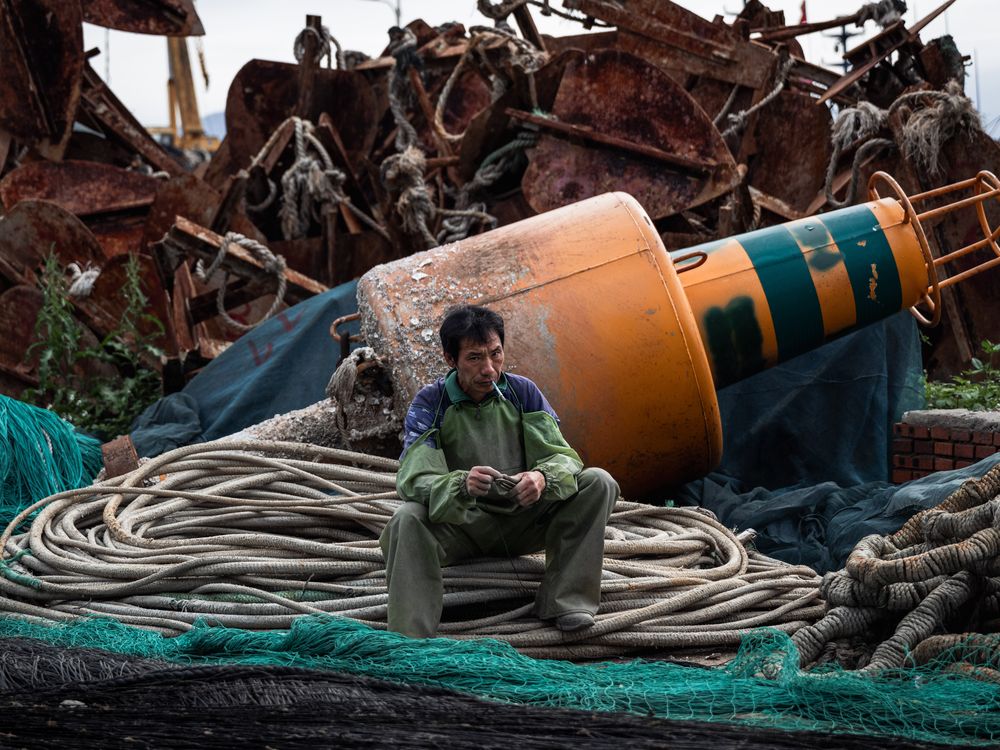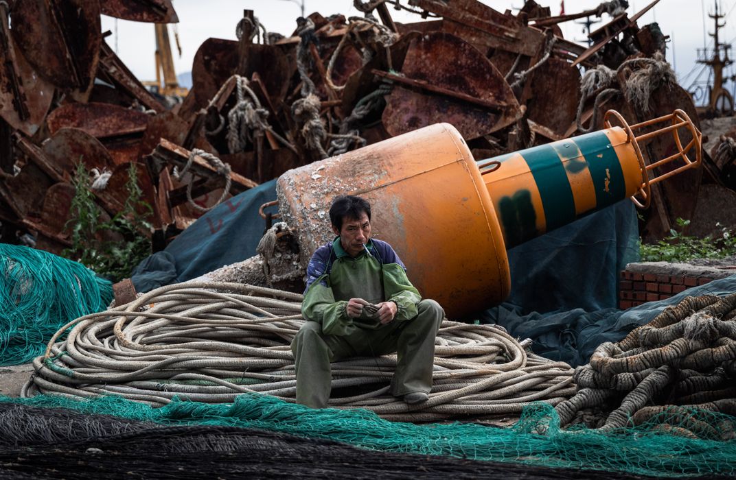 A fisherman takes a smoke break atop coiled rope beside a barnacle-crusted buoy; nets at his feet, rusted anchors stacked behind.