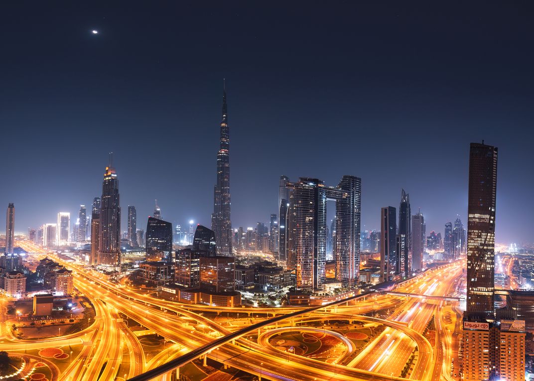 Early morning on Sheikh Zayed Road, Dubai is quiet before the city wakes. The Burj Khalifa towers above the busy flyovers, while the crescent moon casts a soft silver light over the skyline. A moment of calm in the heart of a city that never stops.