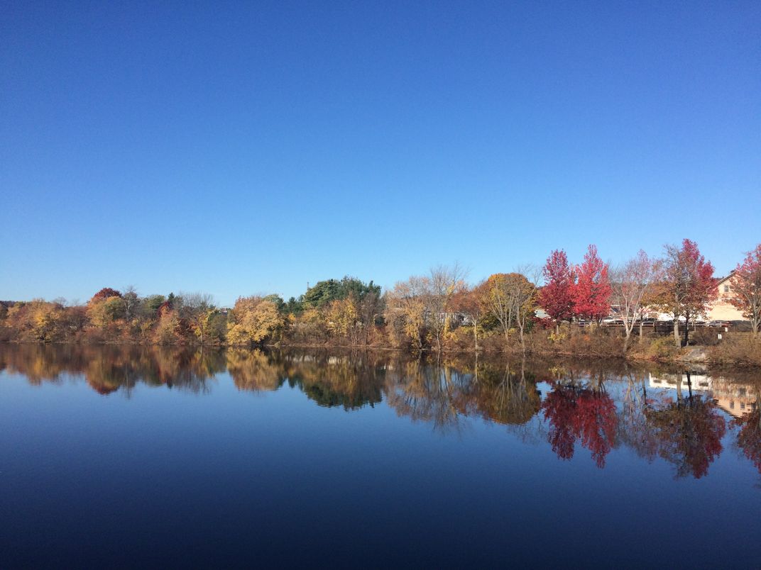 The surface of the water reflects the bright and diverse colors of the trees during Autumn (crimson, yellow, green, and brown) . Also, the fall colors contrast with the blue color of both the river water and the sky.