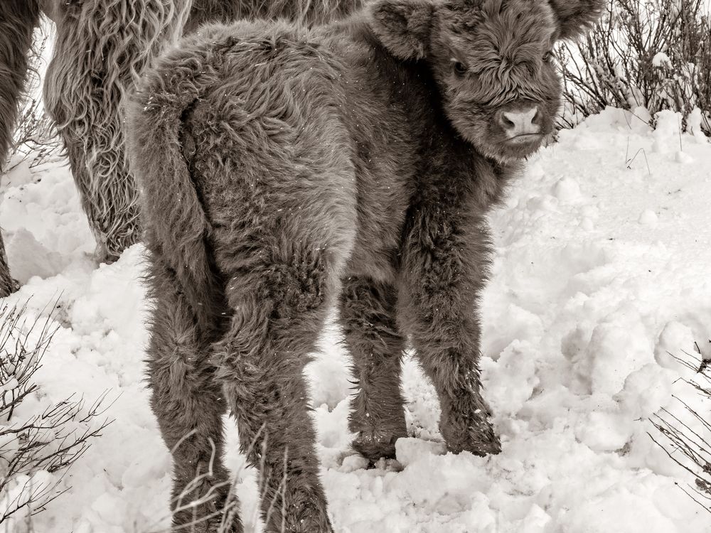 A young Highland calf stands firmly in the snow of the Wood River Valley, a study in resilience. This sepia portrait captures the animal's innocence and raw fortitude against the harsh, beautiful Idaho winter.