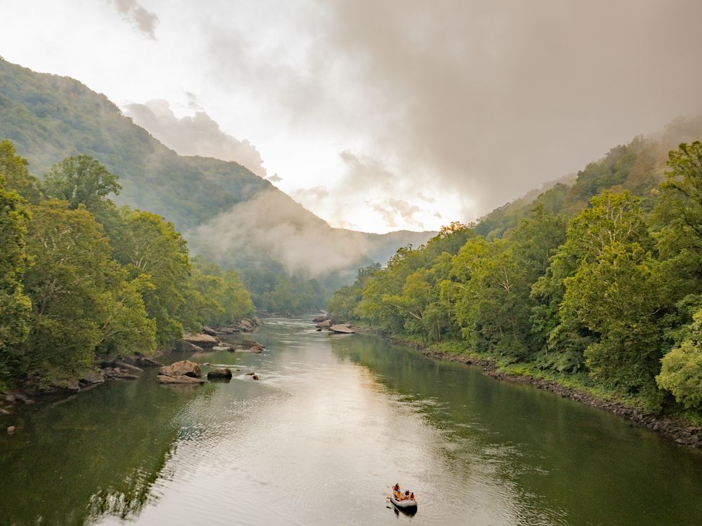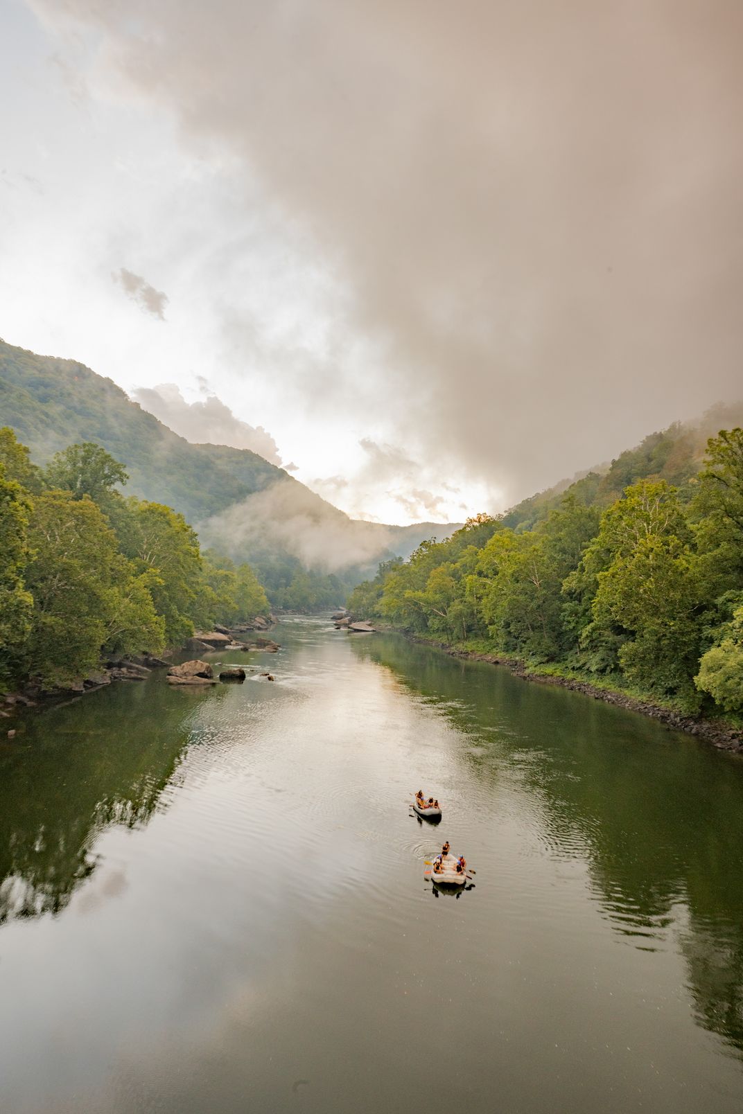 This photo is of a group of river rafters as they float through the New River Gorge.