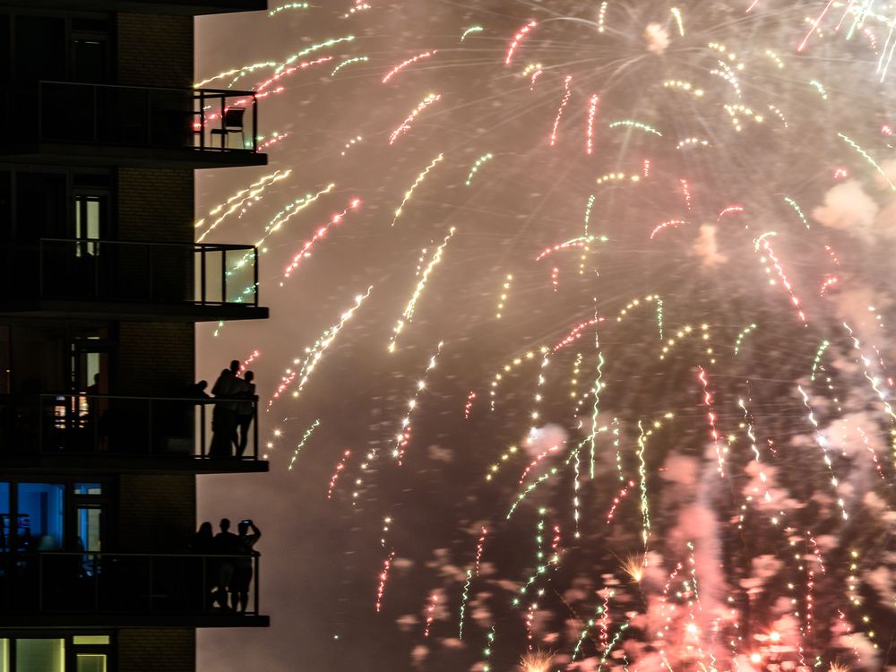 Spectators to the 2017 Macy's Fourth of July fireworks display in New York City watch from balconies of a Long Island City high-rise apartment building as the colorful explosions appear to happen directly in front of them. The fireworks were set off in a series of barges in the East River.