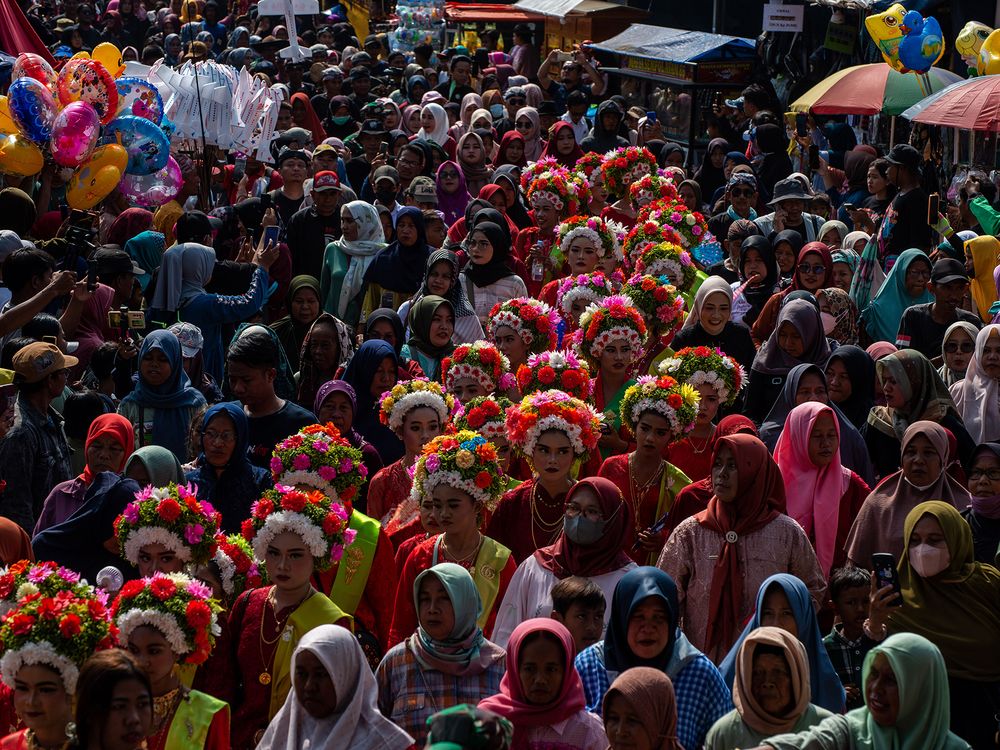 A girl prepares a flower decoration on her head while participating in the Ngarot Traditional Festival celebration in Indramayu Regency, West Java, Indonesia, December 13, 2023. Ngarot is a traditional ceremony held to welcome the rice planting season.