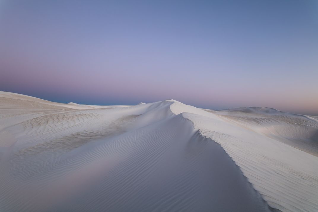 Nightfall softens Wedge Island’s white limesand dunes, making them glow in pastel shades of rose and lilac.