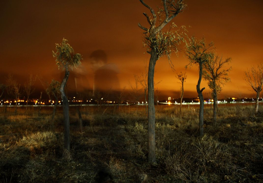 Photographed with a Canon 7D camera. A person walking or moving through the trees is shown blurred and stretched. The color type, composition, and framing are done in a special way.