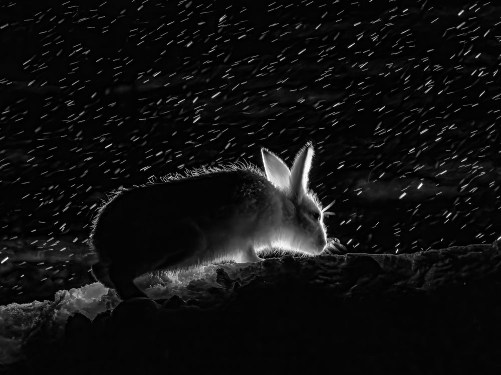 This is a mountain hare in his winter plumage. It came to its feeding place in the middle of a night.
