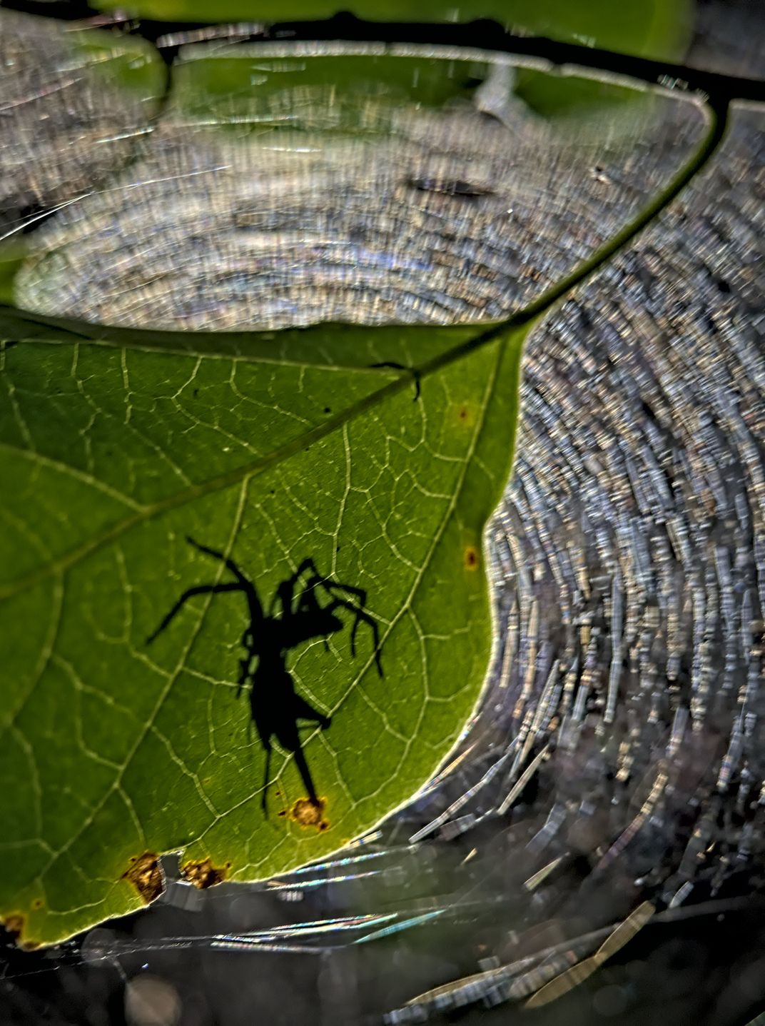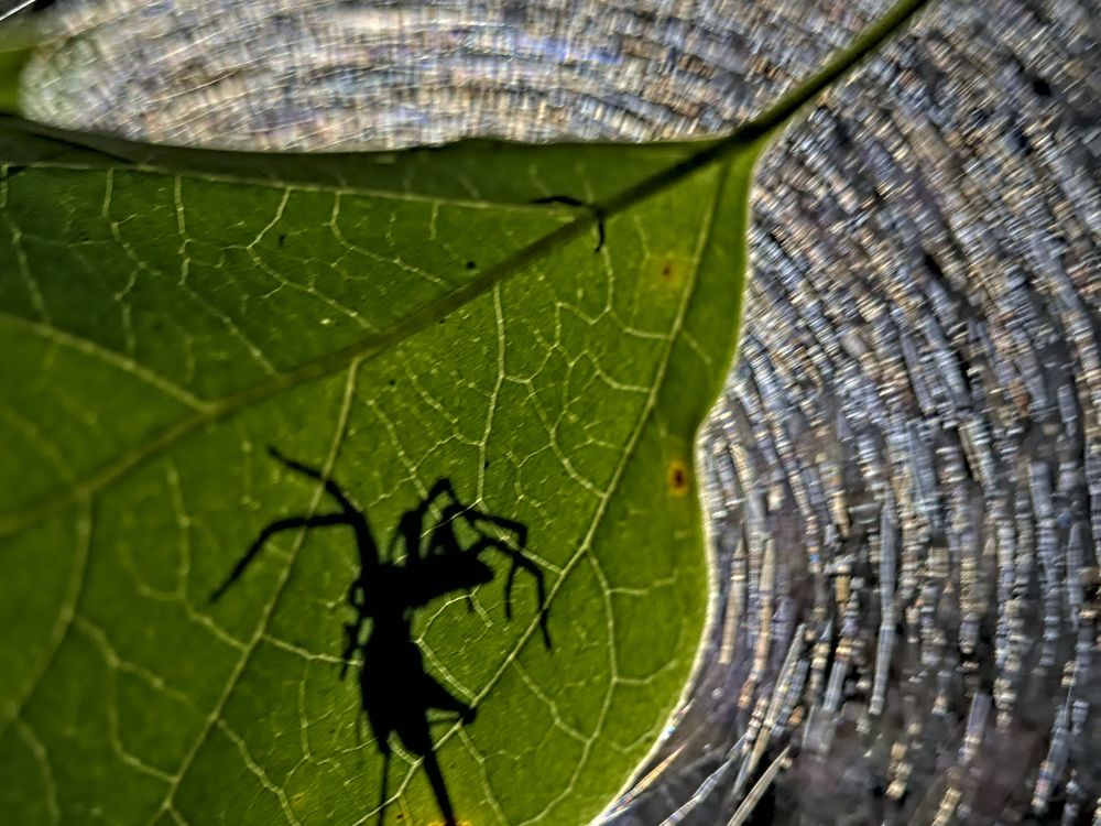 A tent-web spider with a prey. The image was taken in a village in India. Tried to show a very common scene in a dramatic fashion. Using the unique shape of the spiderweb and the leaf as a screen.