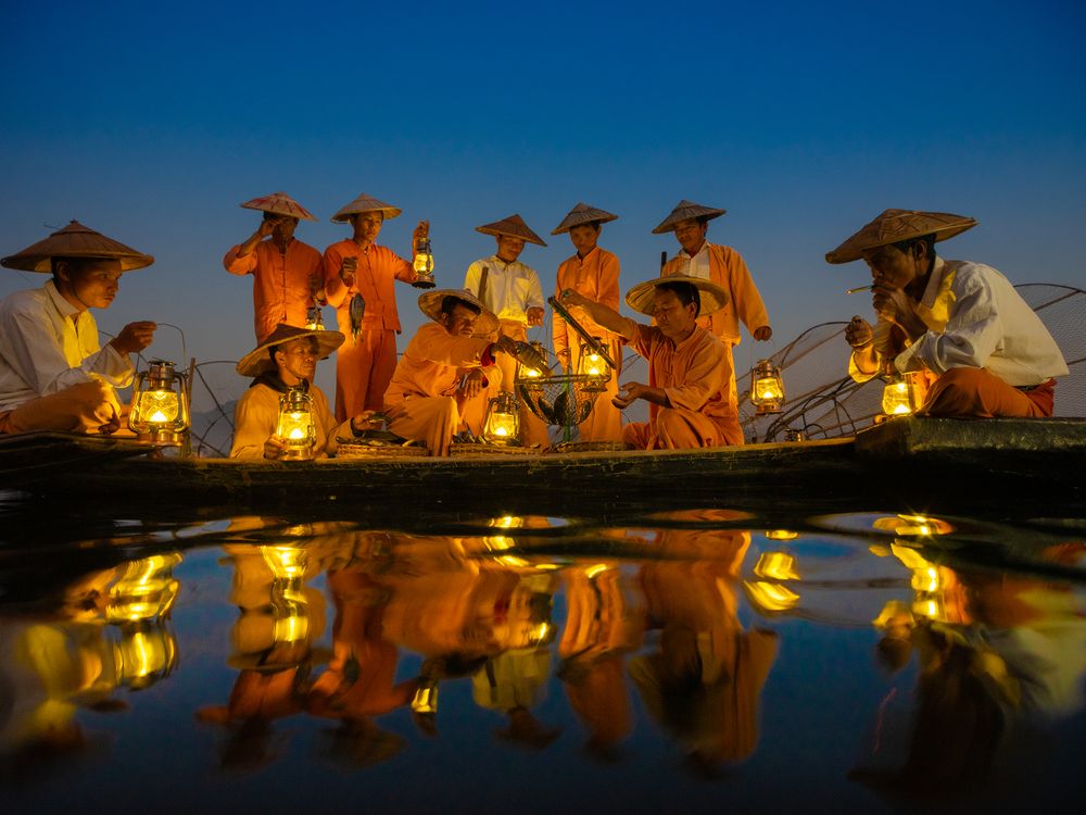 On the serene waters of Inle Lake in Shan State, Myanmar, local fishermen gather at night, their lanterns and headlamps glowing through the mist. While most people recognize the famous Inthar fishermen for their graceful leg-rowing and large bamboo nets, this image reveals a quieter, lesser-seen side of their lives. In the darkness, they continue to fish with small hand nets, blending tradition with subtle touches of modern life. The soft light, smoke, and reflections create a mystical atmosphere — a reminder of how these fishermen adapt to change while preserving their heritage.
