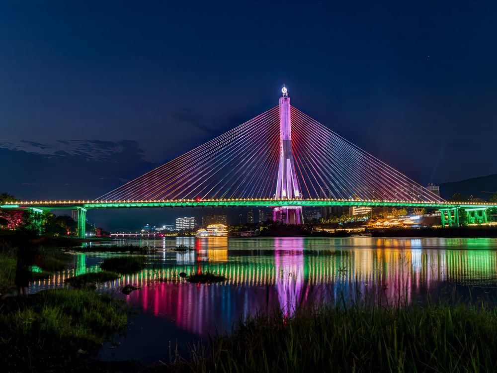 The bridge at night was lit with colorful lights.
