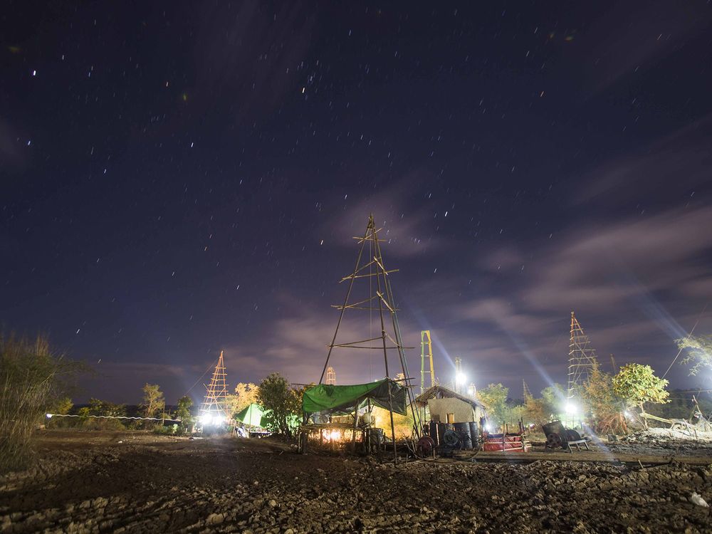The nigh sky filled with stars and moving clouds at the oil mining area in Min Hla, Magway Division, Myanmar. Magway Division is the main area for oil drilling on land in Myanmar's booming oil market. This land never runs out of light, motor bikes, engine smokes, engine drilling sounds and people day and night.