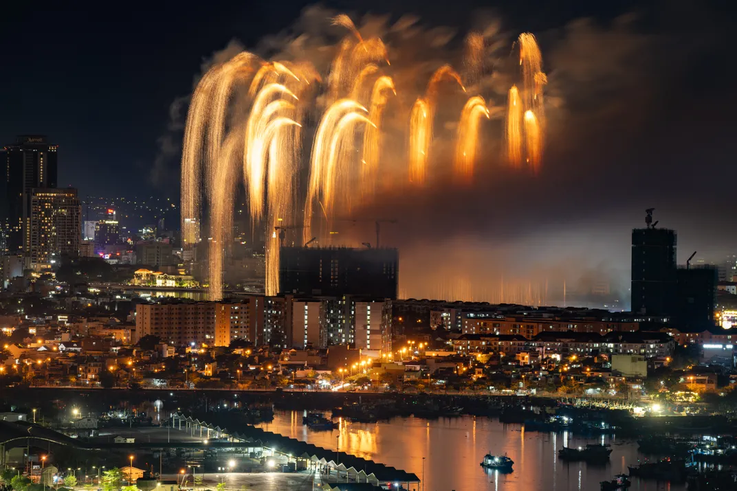 A spectacular burst of color and light over the city, celebrating a festive night. The vibrant fireworks reflect across the water, turning the urban sky into a dazzling symphony.