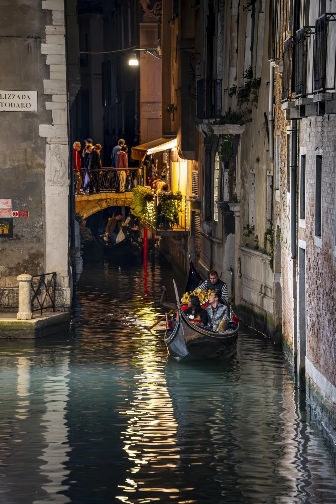 Tourists to Vencie enjoy a night time gondola ride through the city's canals.