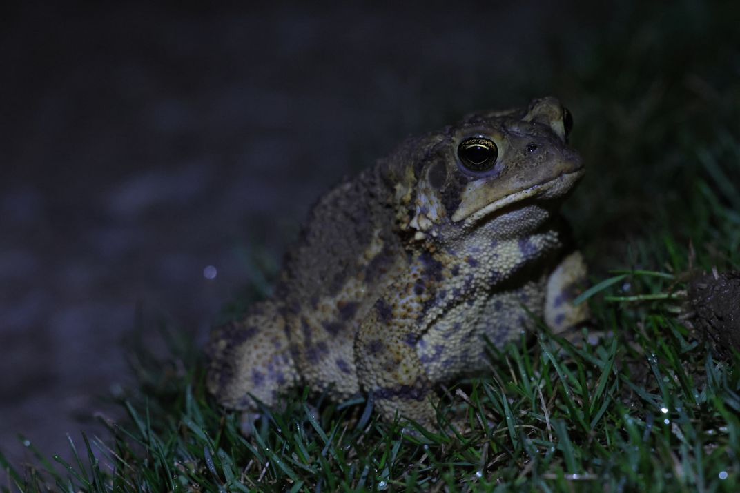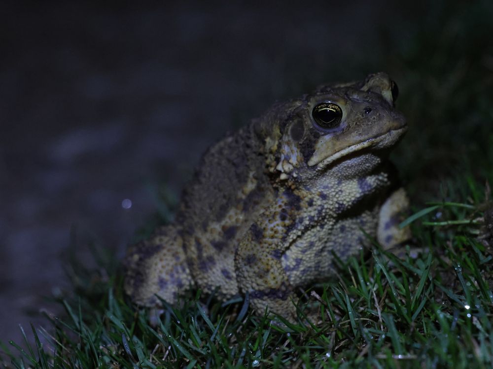 A large frog with golden eyes pauses in the dark while hunting for a late-night snack. The glow from the nearby light revealed its details just long enough for a closer look.