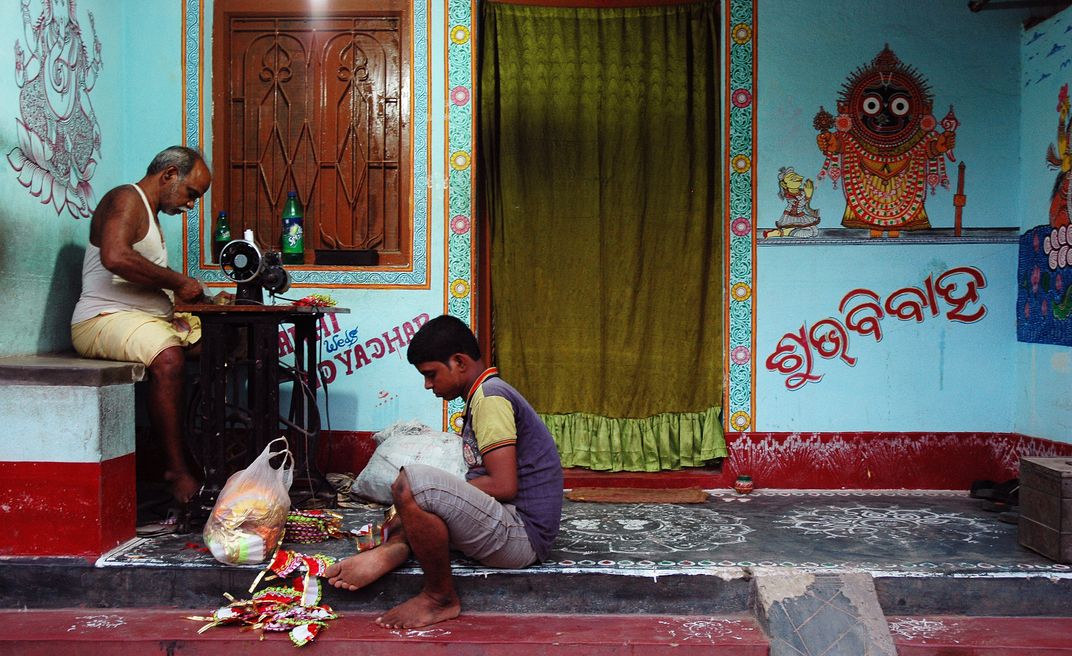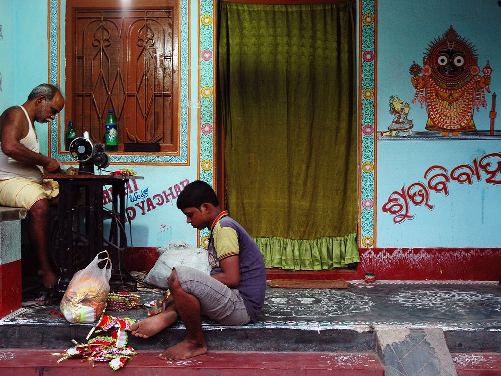 A living tradition in India; Learning from a Guru or Father who is looked upon as a Guru. The image shows just this, the son symbolically at the feet of the Guru, both but with the same level of concentration.