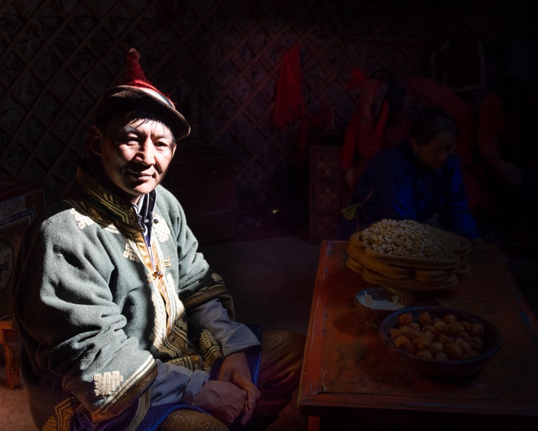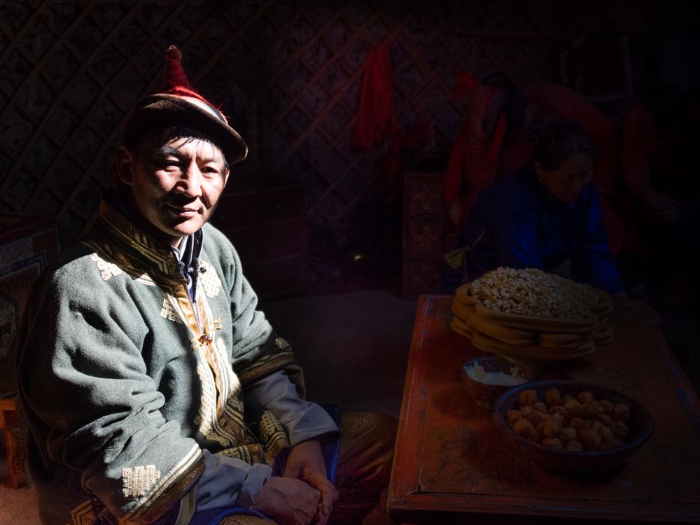 After the folk ger camp program, this nomad agreed to come back into the tent and pose for us photographers.