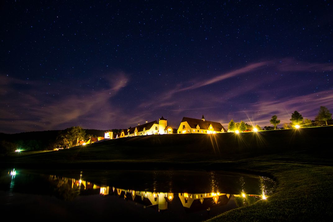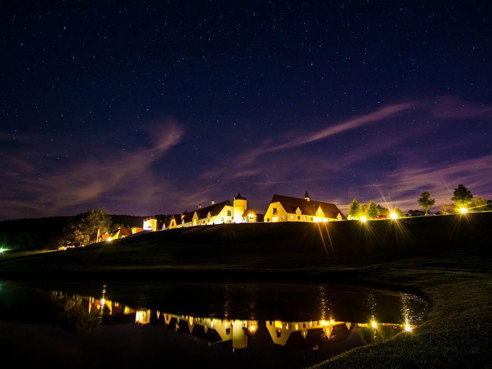 A peaceful night under the stars at Berry College in Rome, Georgia. Normandy, the featured building, glows under a new moon with its reflection on the pond below.