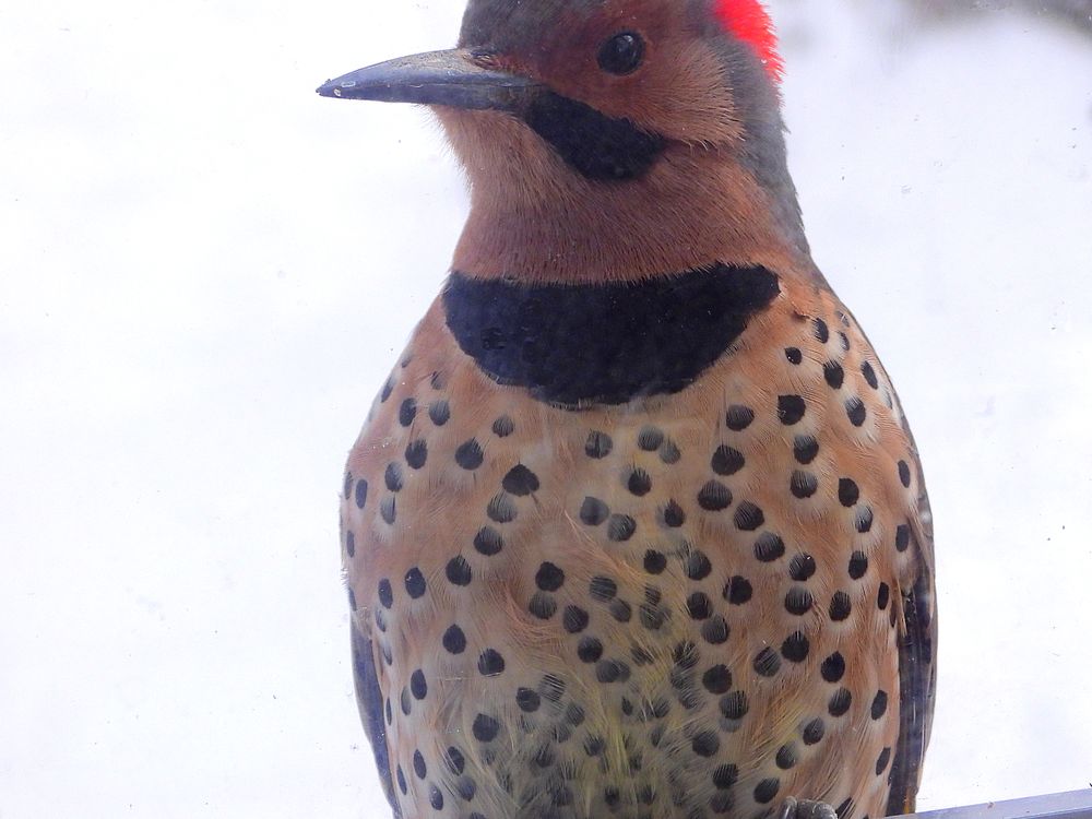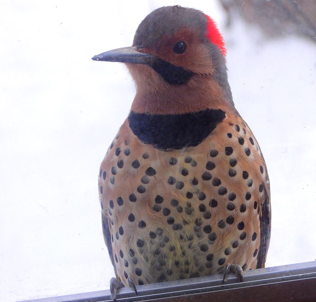 I was surprised to see this impressive looking Flicker fly to our window. Glad I had my camera ready to capture its pose on an overcast snowy afternoon. This big migratory bird had previously been on our feeder in our backyard eating suet and sunflower seeds.