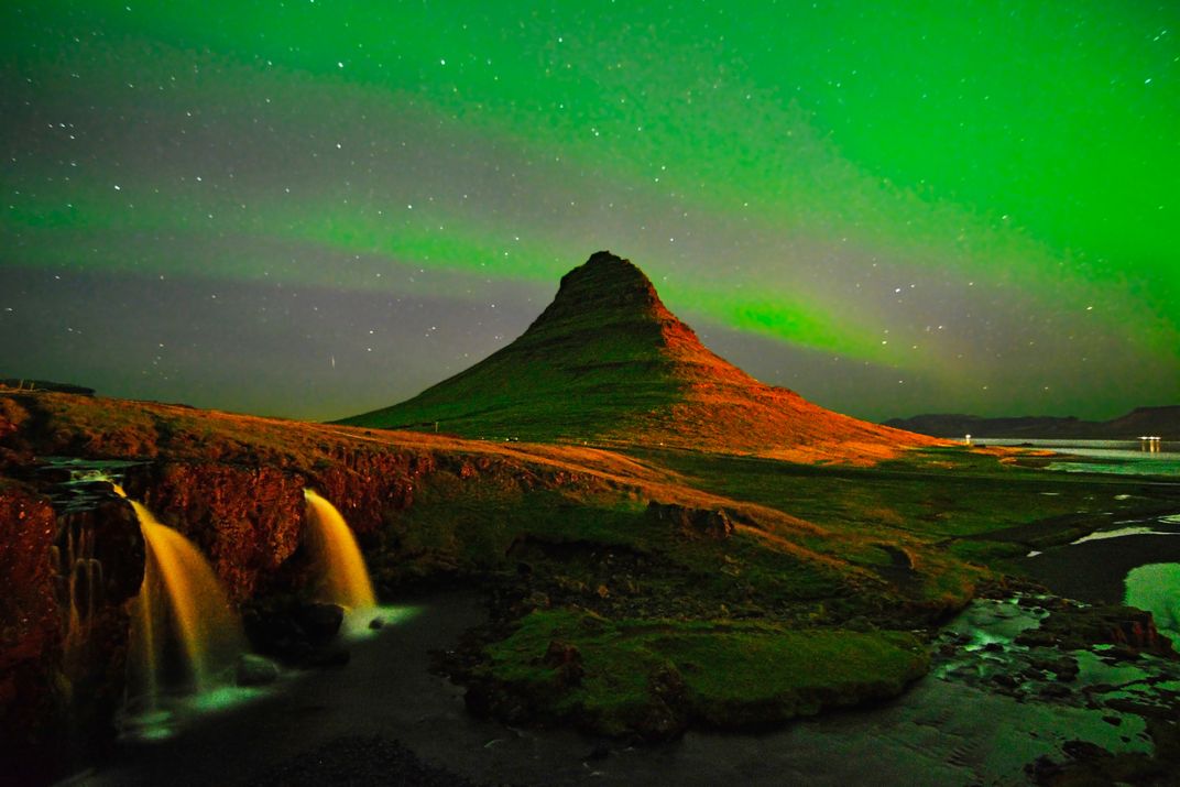 The Northern lights light up the sky above the iconic Kirkjufell mountain in western Iceland. The waterfalls in the foreground look magical in the reflected light in long exposure.