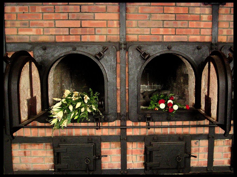 Notorious ovens of Buchenwald Concentration Camp with fresh flowers as a tribute to those who suffered.
