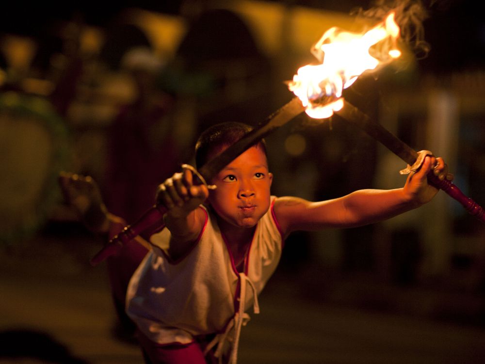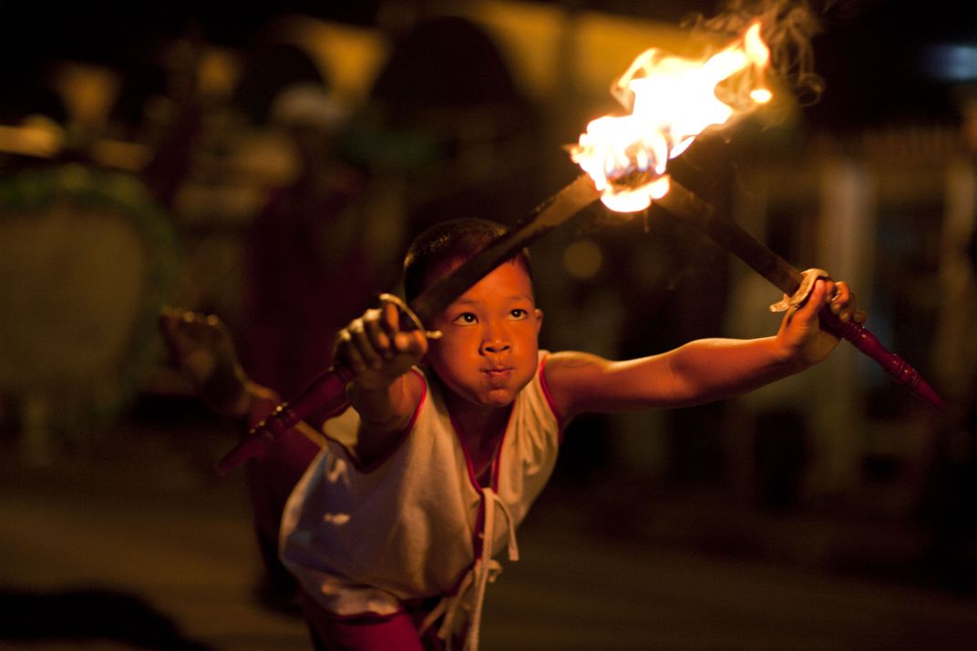 November 2011 Loi Krathong and Yi Peng festival and parade in Chiang Mai, Thailand. A young boy is performing with fire sticks at the parade.