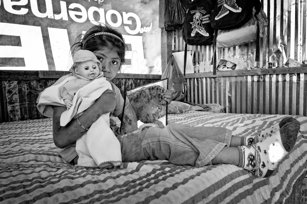 Perla lives with her mother, father and two brothers in the Oaxaca City Dump. The family shares a single bed in their small one room dirt floored tin shack. The shack was built fr