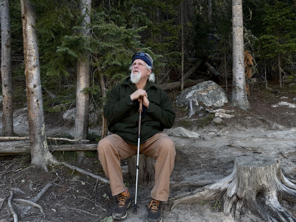 Veteran hikes to Monarch Lake in grand Lake, Colorado, observing the beauty of the lake he is an awe.