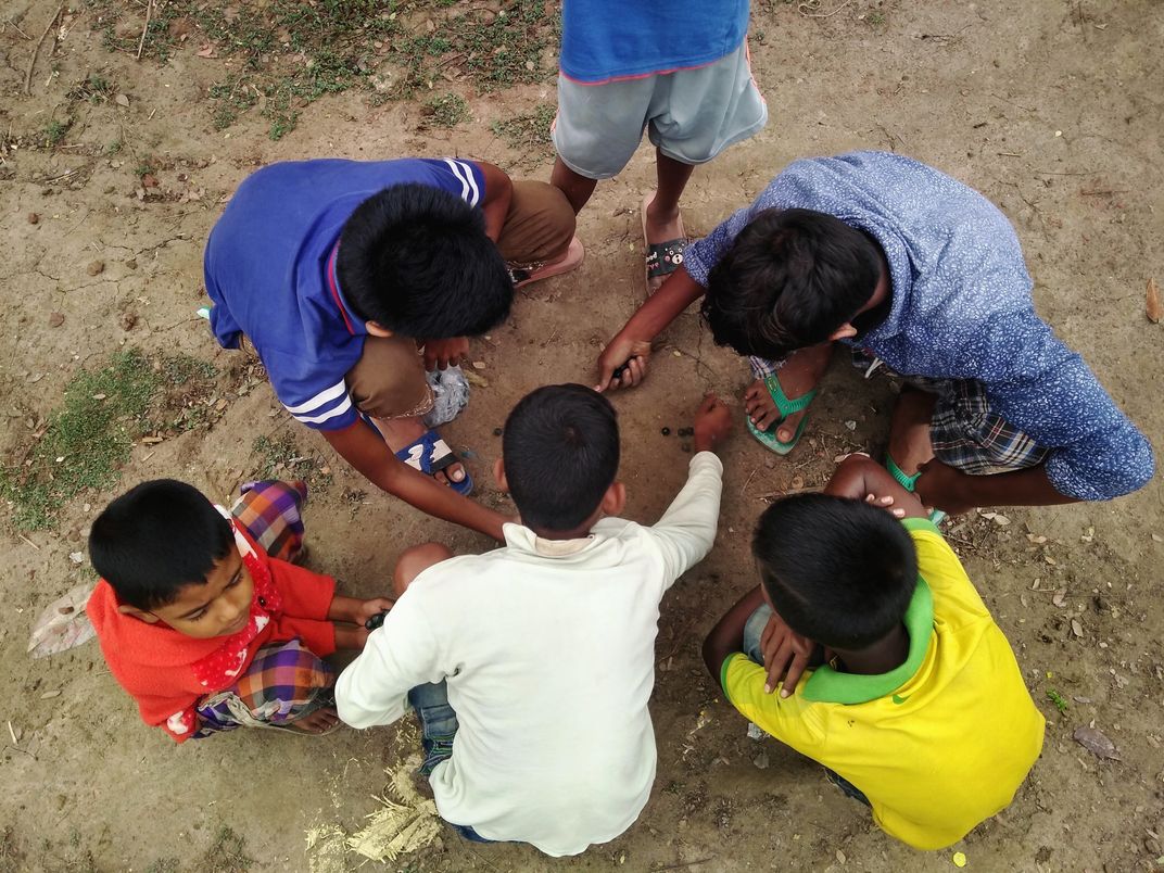 some kids are playing with marbles. As technology has developed people have become gadget dependent. Many games have been lost over time. Still we can see kids playing marbles in village.