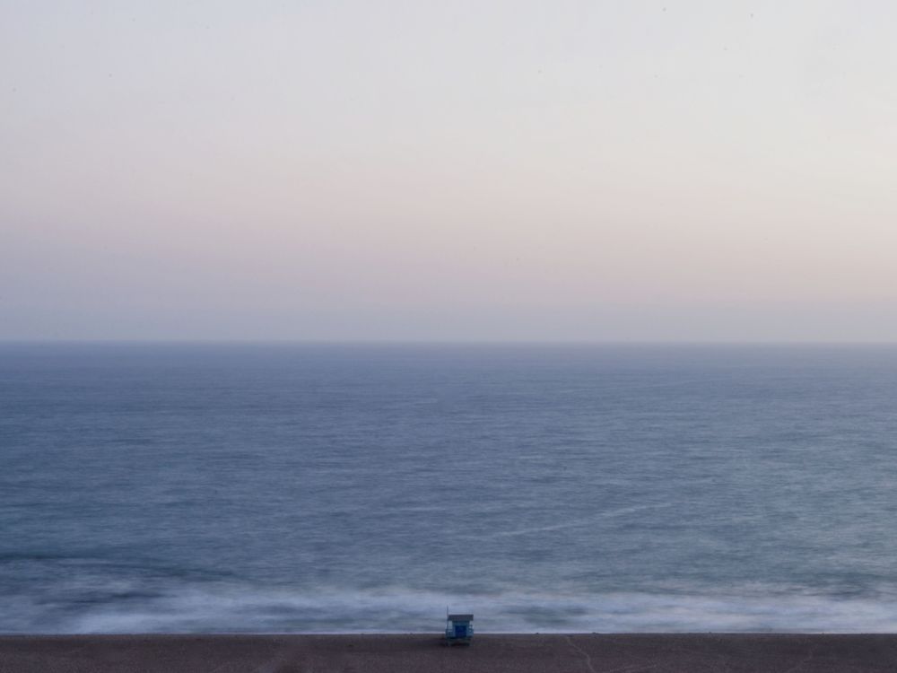 A lifeguard tower stands alone overlooking the Pacific Ocean during sunset.