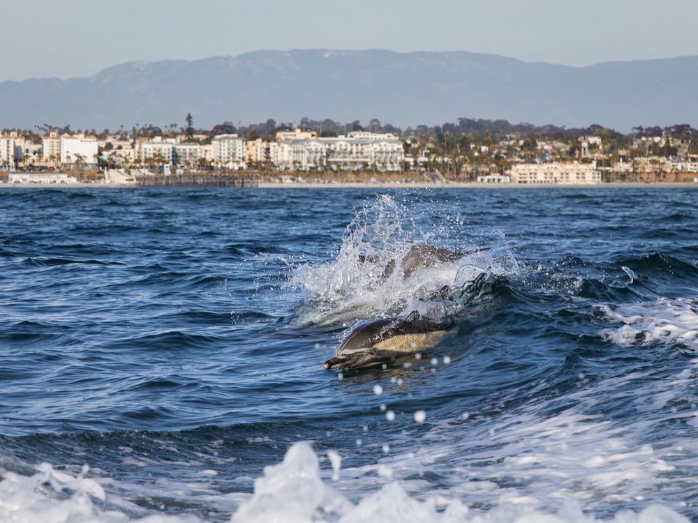 A photograph of dolphins near the California shoreline.